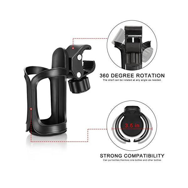 Holder can be rotated 360 degrees It may be fitted on maintain bar, under seat, down tube, fork, front pipe, can be used on most strollers.