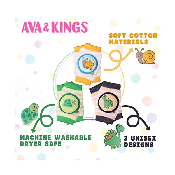 No parent wants to see bruises and scrapes on their baby after a fun, playful day of crawling and hitting their knees and elbows on rough surfaces. Ava & Kings Animal Themed Soft Elastic Infant or Toddler Baby Crawling Knee Pads will help guard your baby’s knees and elbows. These knee and elbow pads keep your baby’s arms and legs warm and protects their bones as they crawl around on cold tiles, shielding baby’s soft sensitive skin from rug burn when transitioning to carpets, and shields their bones from affect when learning to walk or crawl. This bundle of baby infant knee pads comes with 3 pairs of different colors and unisex designs including snail, dinosaur, and turtle. Each knee pad is made from stretchy cotton and the padding is made with soft, breathable, elastic cushion that measure at 2.5″ in diameter, large enough to guard the whole knee area of most infant sizes from 0 to 24 months. The measurement for these slip-on crawling pads have a 5.4″ circumference unstretched and will stay on with anti-slip but gentle elastic bands. These are machine washable and dryer-secure for easy cleaning. This set offers you an excellent idea for what to shop for for babies stuff. It’s perfect gift for baby showers, new moms & dads, or anyone expecting a baby boy or baby girl. *NOTE*: As a result of differences between monitor displays, actual color may vary fairly from image. Ava & Kings is a registered trademark of Remi Collections LLC and is exclusively distributed by Bundle Monster. Ava & Kings trademark is safe by US Trademark Law.