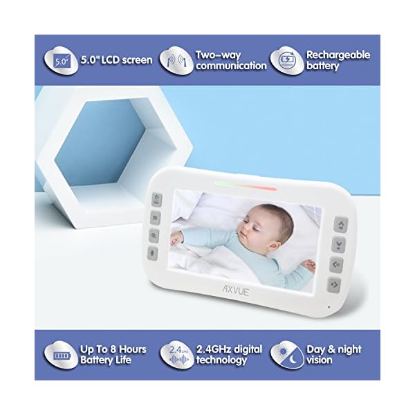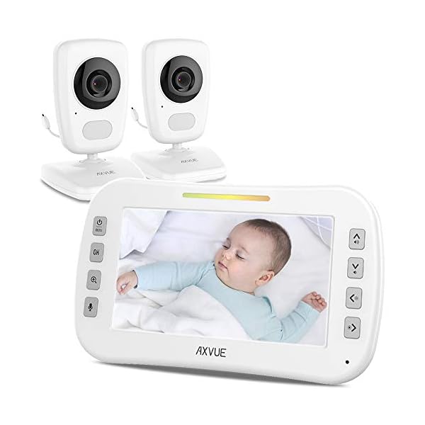 Axvue Video Baby Monitor, Comfortable Slim Design Handheld Enclosure, 5.0″ Screen Monitor & 2 Camera, Range up to 1000ft, 8 Hour Battery Life, 2-Way Talk, Night Vision, Temperature Monitor, No WiFi.