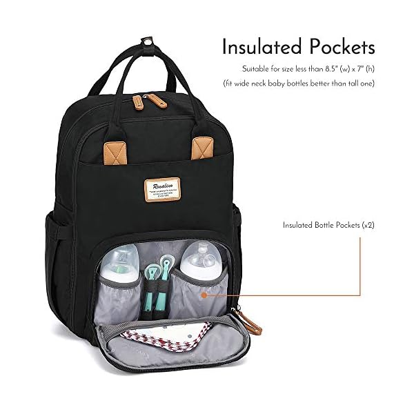 What you’ll get – 1 normal size backpack diaper bag with changing pad (DIMENSION: 11.8l x 7.8w x 16.5h inches, Weight: 1.78lb; Mat Size: 23l x 15w inches). Two big zipper closure compartments and 16 pockets, Spacious enough to hold most of baby essentials and still look perfectly organized and compact, without being too large or too small. Insulated Bottle Pockets can hold most of wide neck baby bottles but the height not more than 7″.