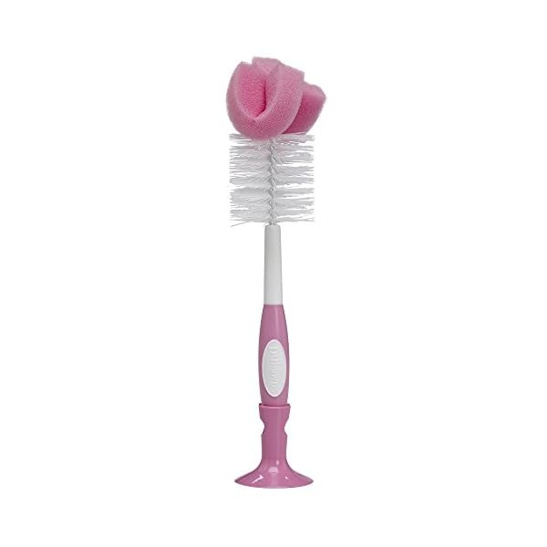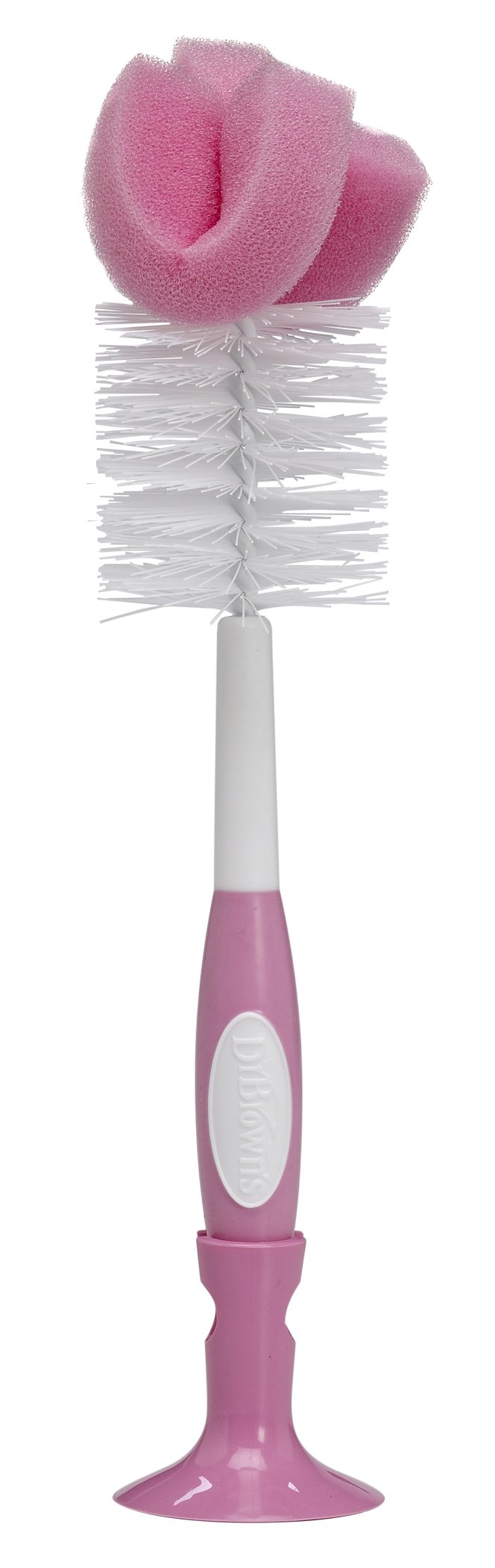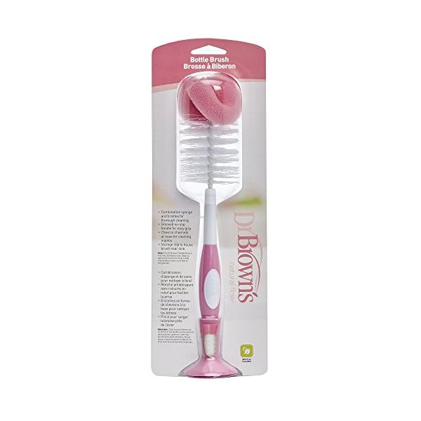 Dr. Brown’s natural flow pink bottle brush features a grooved, no slip handle and a combination sponge and bristle brush head for thorough, easy cleaning of bottles