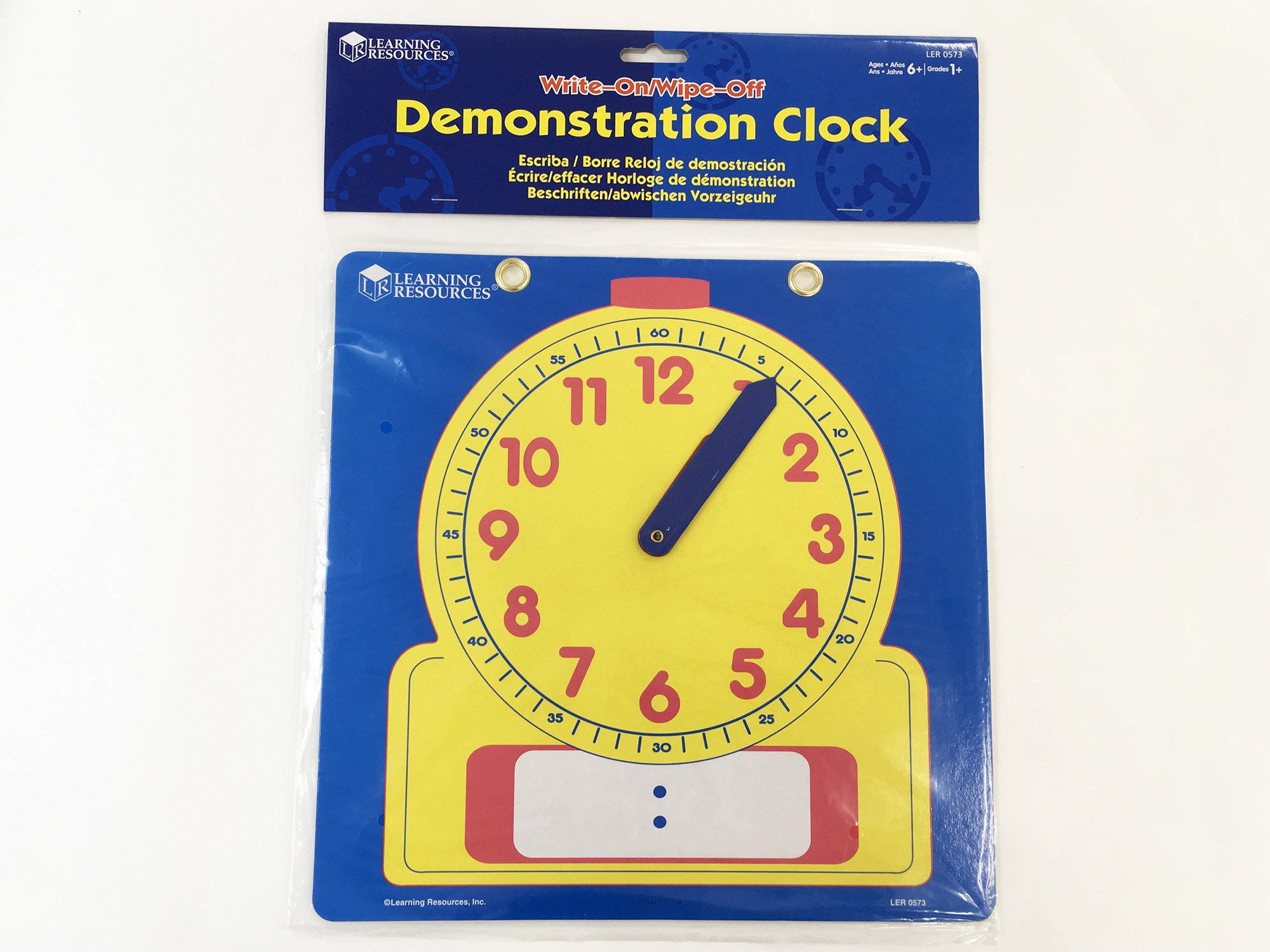 Heavy-duty laminated clock features movable plastic hands and a spot to write down the digital time. Demonstration Clock measures 12″ square.