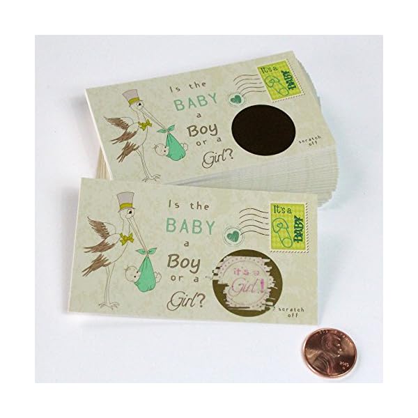 Reveal to your friends and family what the sex of your baby is with this unique Scratch off gender reveal in a Vintage Stork design. Under the scratch off area will reveal If you’re having a boy or a girl. Needless to say to select VARIATION Pink for a Girl and VARIATION Blue for a Boy. If you’re unsure of the sex of your baby- buy an equal value of every sex and then only use the proper sex cards. Cards measure 2″ x 3.5″.